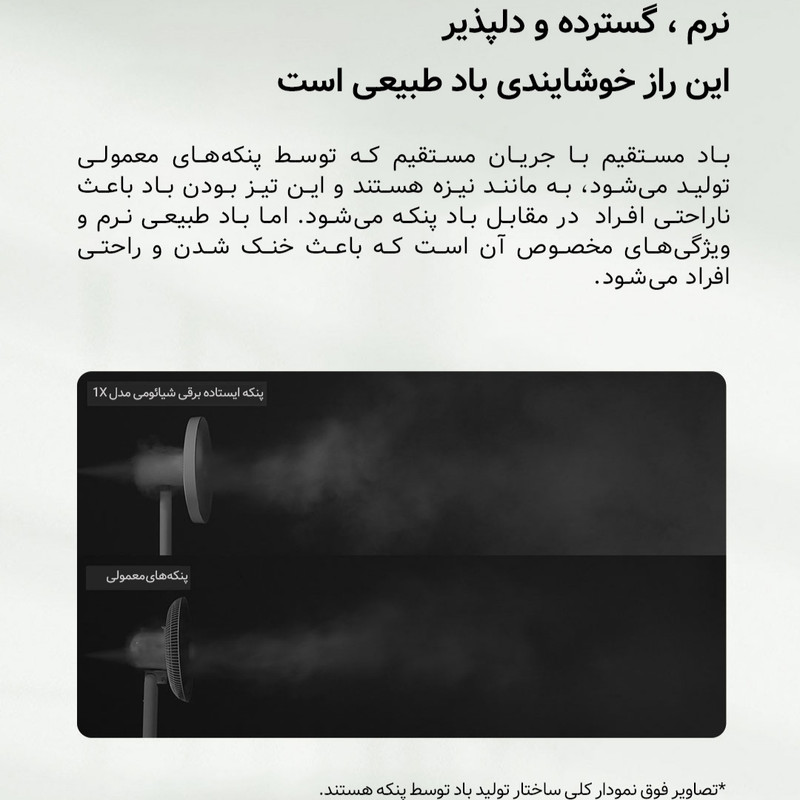 در حال حاضر پنکه هوشمند شیائومی Mi Smart Standing Fan 1Xبسیار هوشمندانه طراحی شده است به گونهای که به سادگی میتوان آن را با گوشی هوشمند کنترل کرد. پس از جفت شدن گوشی هوشمند با این پنکه نمیتوان عملکرد کلیدهای بدنه را از طریق برنامه تحقق بخشید بلکه با کمک برنامه میتوان با نوک انگشتان به آرامی به چرخش جلو یا عقب پنکه کمک کرد تا به یک تنظیم سرعت از 0 تا 100 برسد. در این روند تعویض سرعت، وقفهای وجود ندارد و پنکه به طور طبیعی و پیوسته هوا را به بیرون میفرستد.