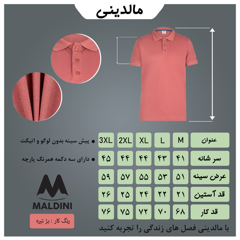 پولوشرت مالدینی از جنس پنبه-پلی استر می باشد که بدون آب رفت و بدون نخ کش شدن می باشد . دوخت این محصول صنعتی بوده که با حساسیت و پیشرفته ترین دستگاه های خیاطی دوخته شده و کاری تمیز و با کیفیت را در اختیار شما قرار می دهد