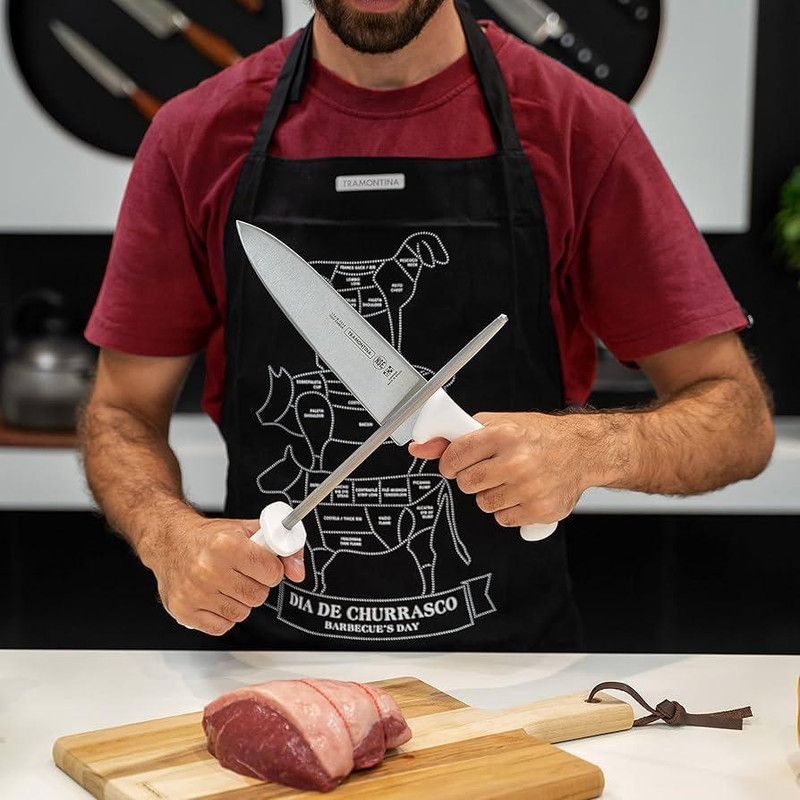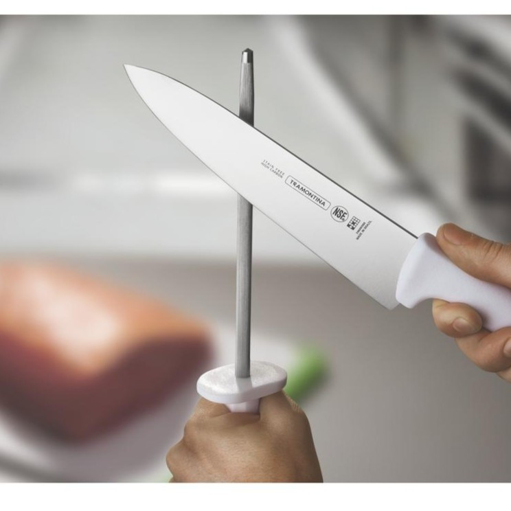 جهت استفاده صحیح از مصقل، لازم است تا چاقو را تحت زاویه 15 الی 20 درجه از مصقل نگه داشته و اقدام به تیز کردن چاقو کنید. روش کار بدین ترتیب است که ابتدا باید لبه برنده چاقو در محل اتصال آن به دسته را بر روی مصقل با زاویه 20 درجه قرار داده و سپس چاقو را به صورت مورب بر روی مصقل حرکت دهید، به طوری که در نهایت نوک چاقو از ناحیه انتهایی مصقل خارج شود. این حرکت را برای سمت دیگر چاقو نیز انجام دهید. این فرآیند را به تعداد 5 مرتبه، تکرار کنید. باید توجه کنید که فقط لبه برنده چاقو باید با مصقل در تماس باشد و نباید سایر قسمتهای تیغه چاقو، به مصقل برخورد کنند. با توجه به اینکه این مصقل از فولاد ساخته شده است، لذا جهت جلوگیری از سیاه شدن مصقل به مرور زمان، فقط به صورت خشک از آن استفاده کرده و از تماس هرگونه رطوبت با آن جلوگیری نمایید. در صورت تماس رطوبت با آن، بلافاصله با استفاده از پارچه، آن را تمیز کرده تا مانع اکسید شدن آن شوید. شما میتوانید از عکس های زیر اموزش صحیح تیز کردن چاقو استفاده کنید.