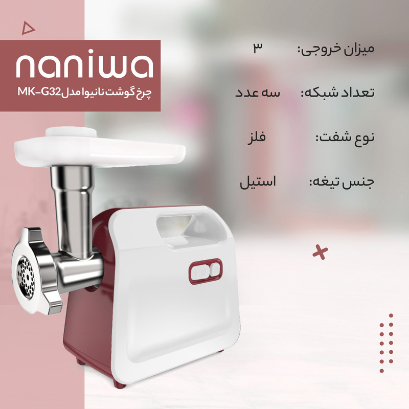 چرخ گوشت، تك كاره برند نانيوا، مدل MK-G32،تولیدات از سازنده توليدي لوازم خانگي نانيوا، ايران، تك سرعته، بدون نمايشگر، توان مصرفي 180 W، جنس بدنه پلاستيكي