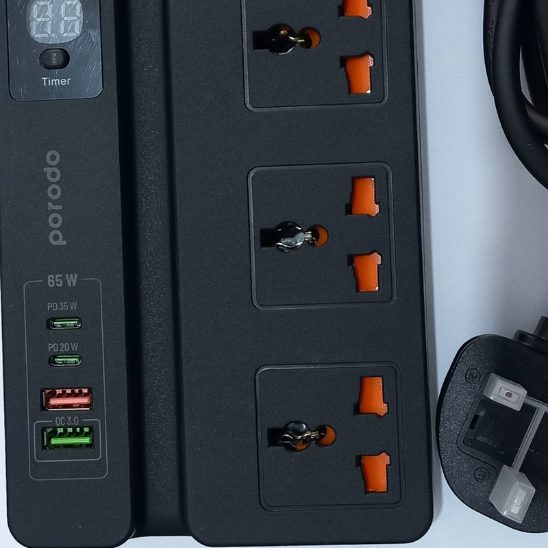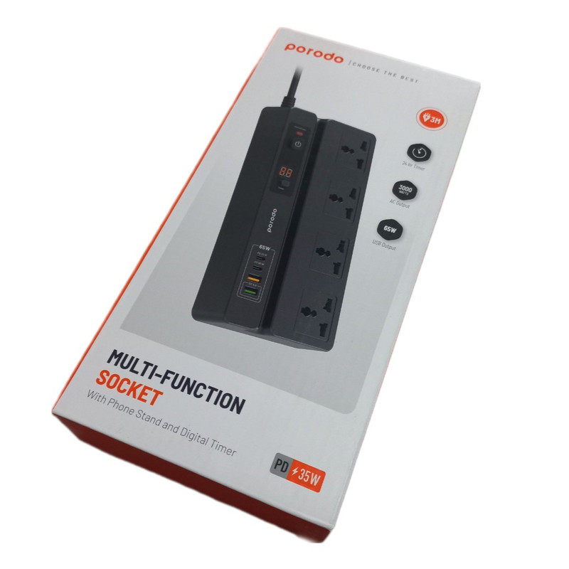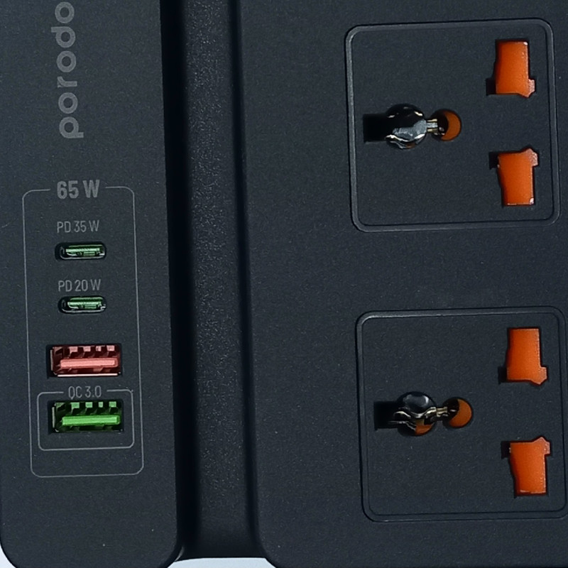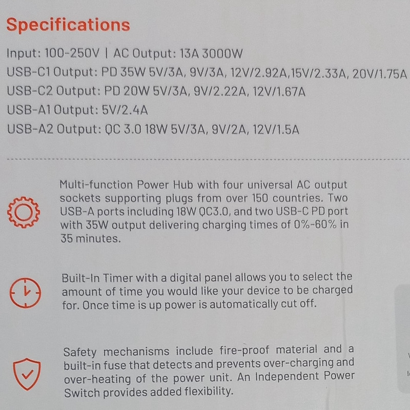 دارای تایمر ۲۴ ساعته دو خروجی تایپ سی ۳۵ و ۲۰ وات شارژر موبایل فست شارژ و PD برای شارژ لپ تاپهای سازگار با شارژ PD و دو خروجی یو اس بی تایپ a شامل QC3.0 با ۱۸ وات توان و چهار خروجی یونیورسال برق شهری (قابلیت اتصال انواع دو شاخه و سه شاخه و سرسوکتهای EU-AU-us-uk )