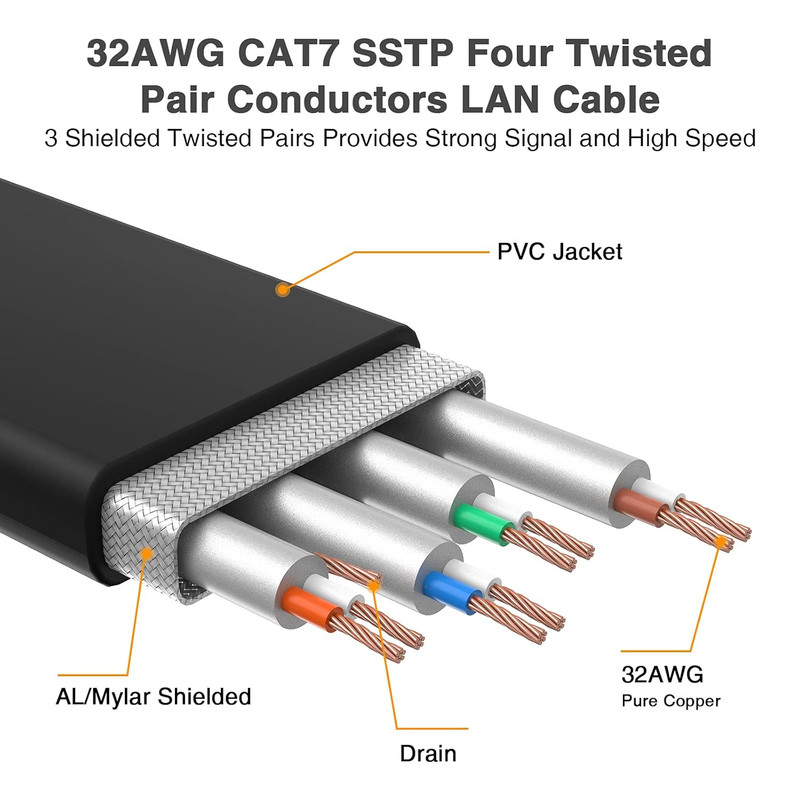 Cat7 تخت - پهنای باند 600 مگاهرتز - سرعت 10 گیگابیت بر ثانیه - کانکتورهای RJ45 طلا اندود شده - سیمهای مسی خالص با شیلد دوگانه - کاهش نویز و اتصال پایدار - سازگار با مودم، روتر، سوئیچ، کنسولهای بازی (PS5، Xbox)، سرورها، دوربینهای IP، پرینترهای شبکه - پشتیبانی از Cat6، Cat5e، Cat5 - طراحی فلت برای انعطافپذیری بالا - امکان عبور از کناره دیوار، زیر فرش، بین لوازم - همراه با گیرههای مخصوص نصب - روکش PVC مقاوم و ضدآب - مناسب برای استفاده داخلی و خارجی - مقاوم در برابر خم شدن و پیچخوردگی.