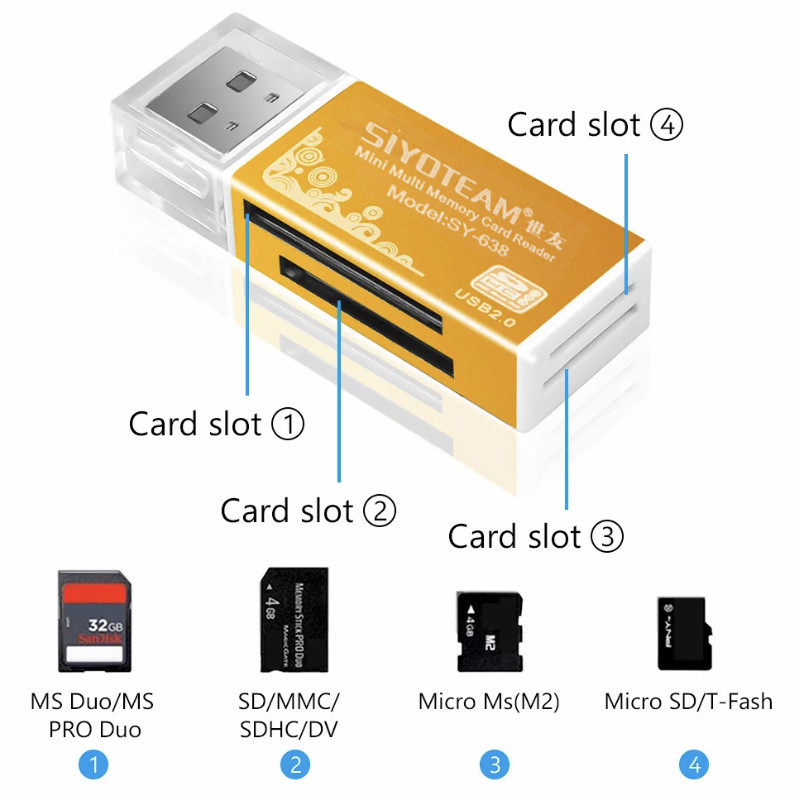 Micro SD/T-Flash, MiniSD, mmc, SDHC, Micro SD, MS, Micro MS (M2), SD,DV, MS DUO, MS DUO PRO