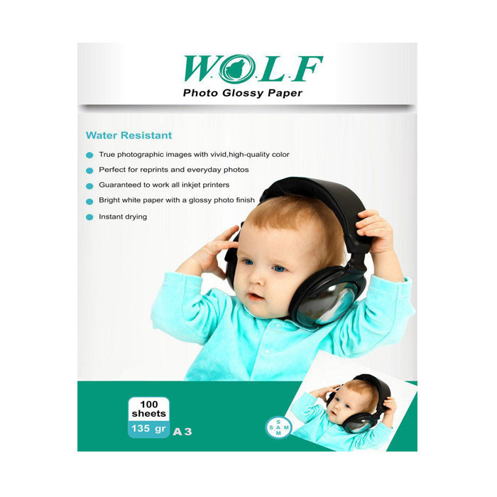 اگر یک پرینتر خانگی A3 داشته باشید، میتوانید سوژههایی که با تلفن همراه یا دوربینهای حافظهدار عکاسی کردهاید را روی کاغذ فتوگلاسه «ولف»(Wolf) چاپ کنید و از کیفیت آن نهایت رضایت را داشته باشید. ولف شامل ۱۰۰ عدد کاغذ ۱35 گرمی است؛ این تعداد کاغذ میتواند هم مقرونبهصرفه باشد و هم تا مدتی طولانی شما را از خرید کاغذ بینیاز کند. ولف سطحی صیقلی و براق دارد و عکسها را با بهترین کیفیت به شما ارائه خواهد نمود. کاغذ فتوگلاسهی ولف برای پرینترهای جوهرافشان مناسب است. کاغذ ولف ضد آب است و اگر احیاناً مرطوب شد جای نگرانی وجود ندارد. هر بسته کاغذ 42 سانتیمتر طول و 29.7 سانتیمتر عرض دارد. مکانهایی مثل مراکز سیتیاسکن، آتلیههای عکاسی و دفاتر فنی، بیشترین سر و کار را به این نوع کاغذها دارند و به همین دلیل باید به کیفیت آن توجه کنند؛ پس ما کاغذ فتوگلاسه ۱۳۵ گرمی ولف سایز A3 را به شما پیشنهاد میکنیم.