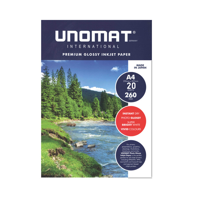 کاغذ ۲۶۰ گرم پریمیوم فتوگلاسه ، کاملا ضد آب با تکنولوژی انحصاری تکنولوژی vivid colours . خشک شدن بلافاصله جوهر . قیمت اقتصادی با کیفیت بسیار بالا ، ماندگاری چاپ مناسب ، پشت مارک دار ( برند یونومات در پشت کاغذ درج شده است ) بسته 20 برگی