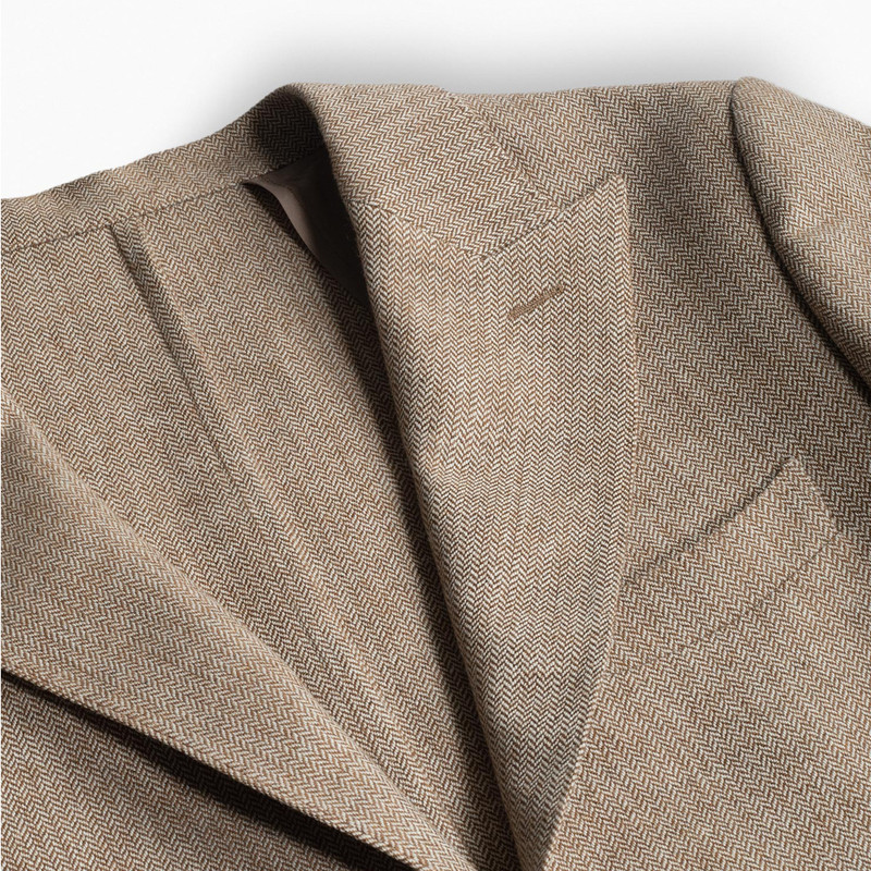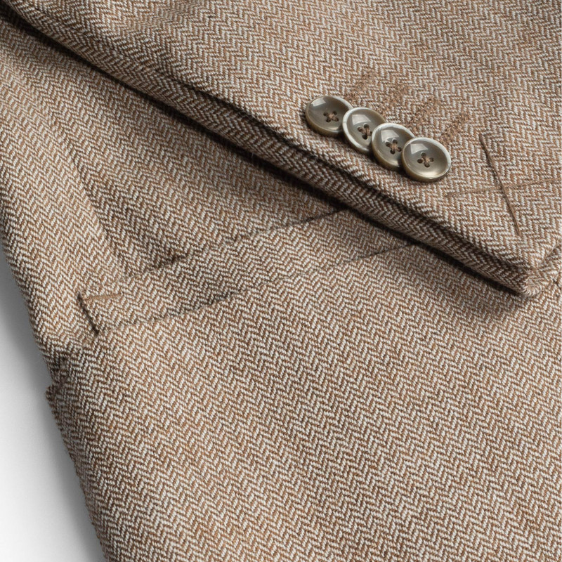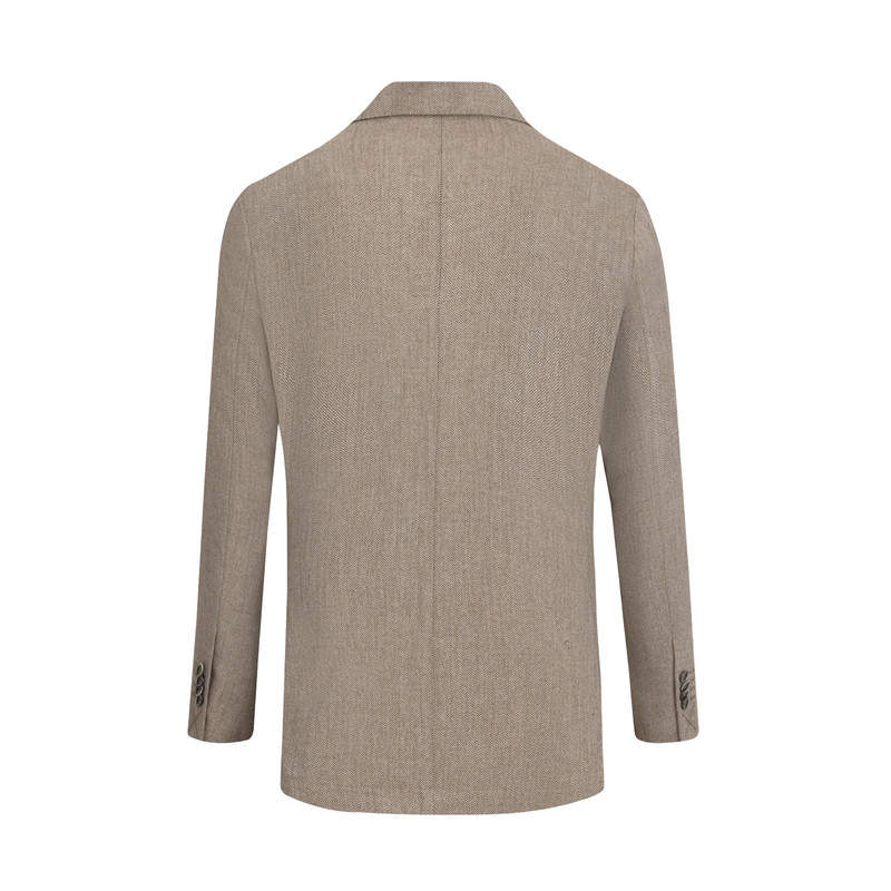 کت تک دو دکمه، دو چاک در پشت، دارای دو جیب و یک جیب روی سینه جهت استفاده از پوشت، طراحی به صورت بدون آستر