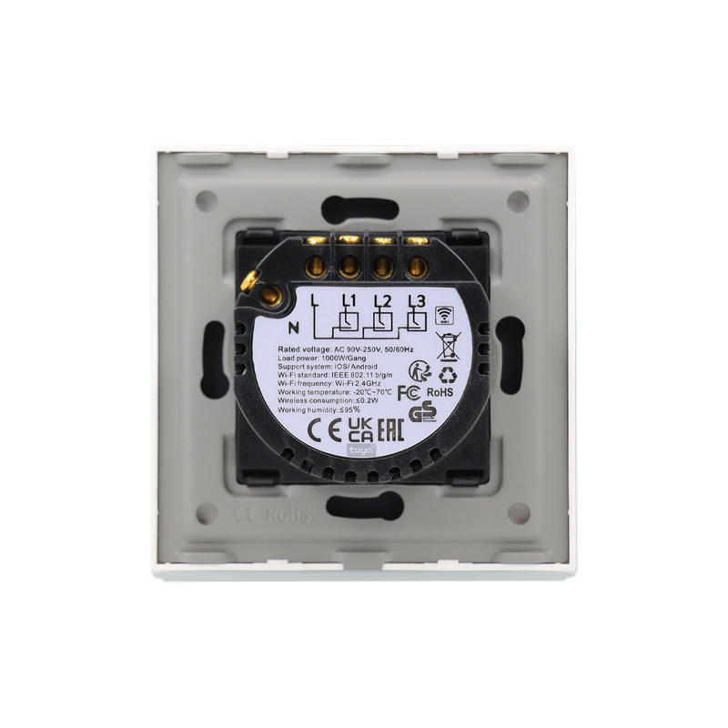 3پل با 3خروجی/1فاز و 1نول/ WI-FI+RF/نصب در قوطی استاندارد آکس 86/رله 3 آمپر تعداد رله 3 عدد/پروتکل Wi Fi , Bluetooth/قابلیت اتصال از راه دور از تلفن همراه با استفاده از اپلیکیشن/قابلیت زمانبندی و تعریف سناریو