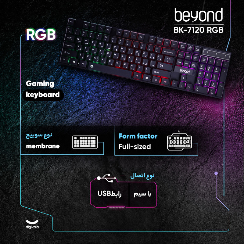کیبورد بیاند مدل BK-7120 RGB، سوئیچ ممبران، Full-Size، نورپردازی LED RGB