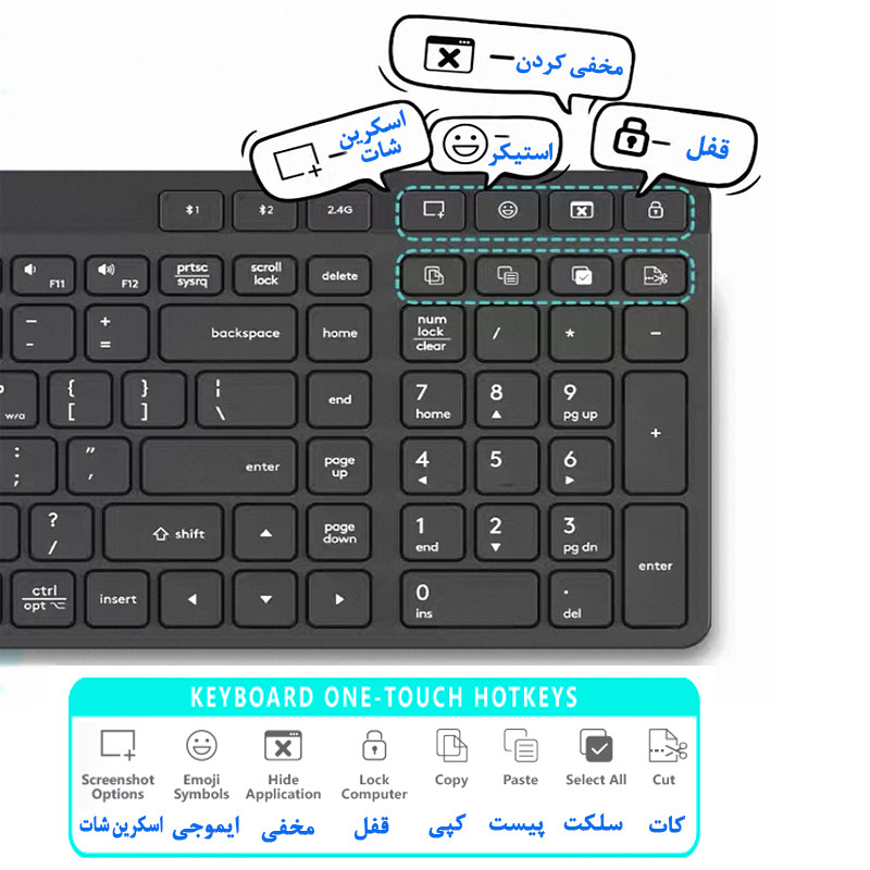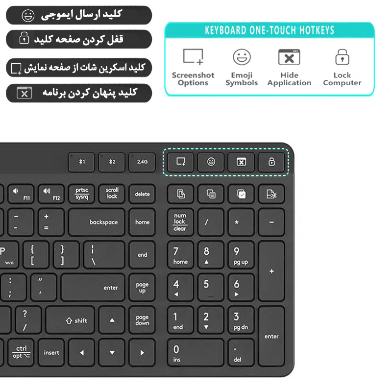 طراحی بسیار باریک/ دارای کلید های اسکرین شات/ کلید مخفی کردن برنامه ها/کلید ارسال ایموجی/کلید قفل کردن صفحه کیبورد / کلید کپی/ کلید سلکت کردن / کلید پیست کردن / کلید کات کردن/ ضد گرد غبار / متصل شدن همزمان به 3 دستگاه ( 2 دستگاه بلوتوث 1 دستگاه وایرلس) و بین دستگاهای متصل با یک کلید سویچ میشود. قابلیت پشتیبانی از تمام دیواس ها / فناوری Quiet Key Keyboard به منظور سرعت پاسخ دهی بیشتر و بدون تاخیر/