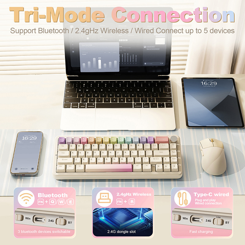 برای کاربران مولتیدستگاه: جابجایی ساده بین ۵ دستگاه به کمک بلوتوث و 2.4G.