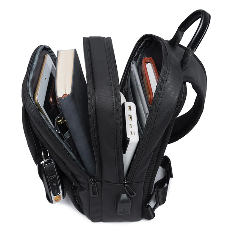 کیف 77107 با ابعاد 30x19x8 سانتیمتر میتواند هر آنچه که شما برای استفاده روزانه نیاز دارید را در خود جای دهد. دارای دو محفظه بزرگ، با جیبهای متعدد میتواند نیازهای شما برای سفر و استفاده روزانه را برطرف نماید. در محفظههای اصلی میتوانید لوازمی اعم از تبلت 9.7 اینچ، کتاب، کیف پول، هدفون، پاوربانک و... مناسب است. در قسمت جلوی این کیف دو جیب مجزا تعبیه شده که هر کدام دارای زیپ هستند. یکی در قسمت پایین قرار گرفته و زیپ آن از سمت کنار دسترسی سریعتری را برای شما فراهم میکند. دیگری در قسمت بالا قرار گرفته که برای قرار دادن اشیاء دم دستی مناسب است. به علاوه یک جیب مخفی با امنیت بالا در پشت کوله قرار دارد که میتوانید لوازم مهم خود را در آن قرار دهید. طراحی جیبهای متعدد، موجب میشود تا شما بتوانید لوازمتان را مرتب نگه دارید، همچنین قرار دادن هر وسیله در جای جداگانه و مخصوص دسترسی به آنها را آسانتر میکند.