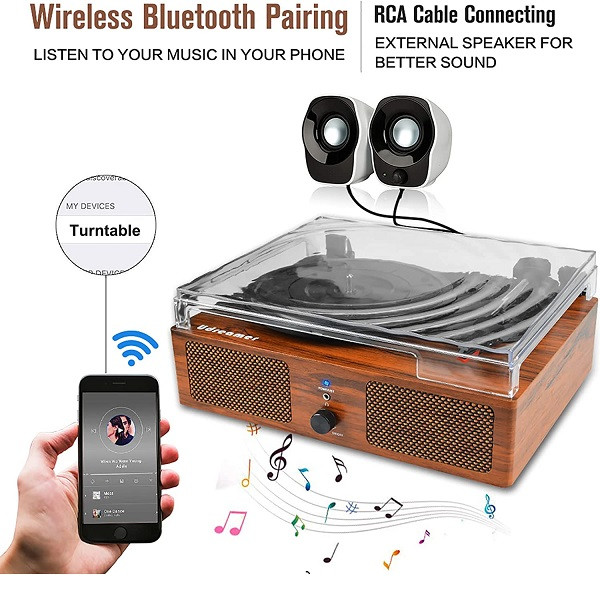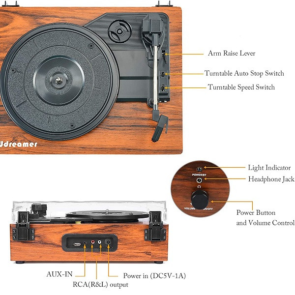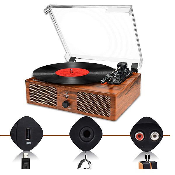 دارای 3 سرعت و 3 اندازه رکورد / سرعت چرخش (33-1/3، 45 و 78 دور در دقیقه) و 3 اندازه رکورد (7 اینچ، 10 اینچ و 12 اینچ) / مجهز به دکمه توقف خودکار / منبع تغذیه آداپتور 5 ولت 1.5 آمپر (7.5 وات) / مجهز به موتور DC / سازگار با گوشی های هوشمند / دارای پورت RCA برای اتصال به اسپیکر و خروجی صدای بیشتر