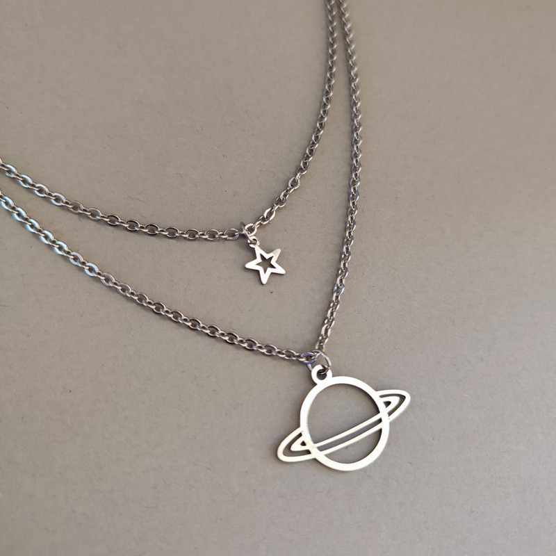 یک گردنبند خاص و منحصر به فرد با طراحی الهامگرفته از آسمان و سیارات است. این گردنبند به شکل دو لاین (خط) طراحی شده که یک طرف آن نماد ستاره و طرف دیگر نماد سیاره زحل را نمایش میدهد.