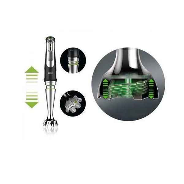 موتور پر قدرت با توان ۱۰۰۰ وات، دارای ظرف خردکن جهت استفاده روزمره با حجم ۵۰۰ میلی لیتر که جهت استفاده وعده های غذایی بسیار مناسب و کاربردی میباشد، نسل جدید پایه های گوشت کوب برقی براون که علاوه بر قدرت چرخش بالا حرکت پایه به سمت بالا و پایین باعث میکس سریع تر و یکدست تر مواد غذایی میشود، دارای پایه پوره کن جهت تهیه پوره سیب زمینی و تهیه اسموتی های مختلف، دارای پره همزن نرم جهت تهیه سس، دوغ، سفیده تخم مرغ و …، دارای لیوان میکس مواد غذایی، قدرت موتور قابل تنظیم که با فشردن دکمه قدرت موتور تغییر میکند، طراحی و مهندسی در کشور آلمان مونتاژ نهایی در کشور رومانی