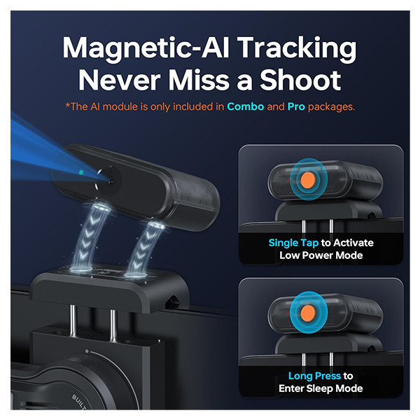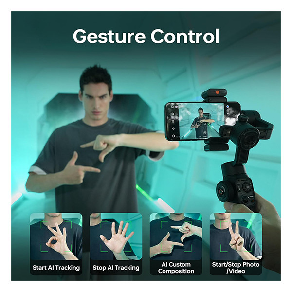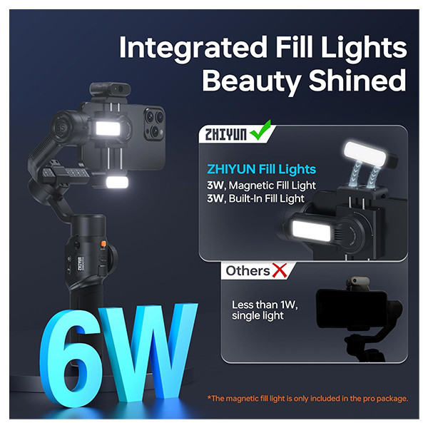 گیمبال Zhiyun Smooth 5S AI Pro، ماژول هوش مصنوعی (AI Tracker)، نور پرکننده مغناطیسی، پایه سهپایه، کابل شارژ USB-C، کیف حمل، بند مچ، کارت VIP، فیلترهای رنگی نور و دفترچه راهنما