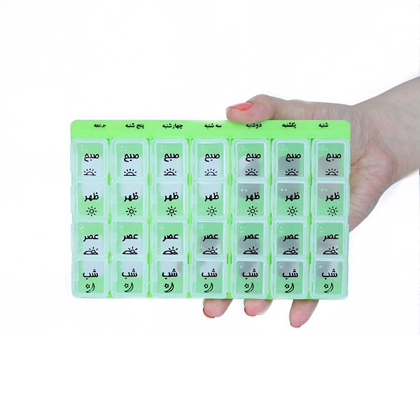 ویژگی های تقویم دارویی: • ساخت ایران • محفظه شفاف • روزانه هفتگی تقویم دارویی دارای 7 روز هفته به صورت مجزا و هریک به تفکیک صبح، ظهر،عصر و شب • نوع روزانه دارای 4 قسمت مجزا برای صبح، ظهر، عصر و شب • قابلیت جدا شدن روزها • منقش جهت استفاده نابینایان